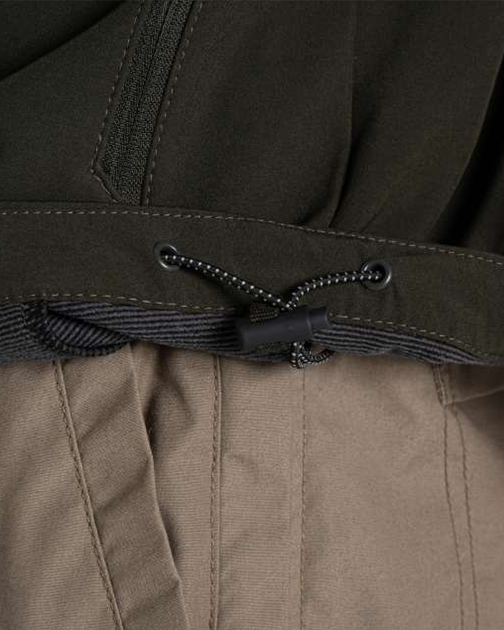 Exteriorul inteligent din poliester elastan are un finisaj hidrofug și un spate din microfleece în dungi pentru căldură suplimentară